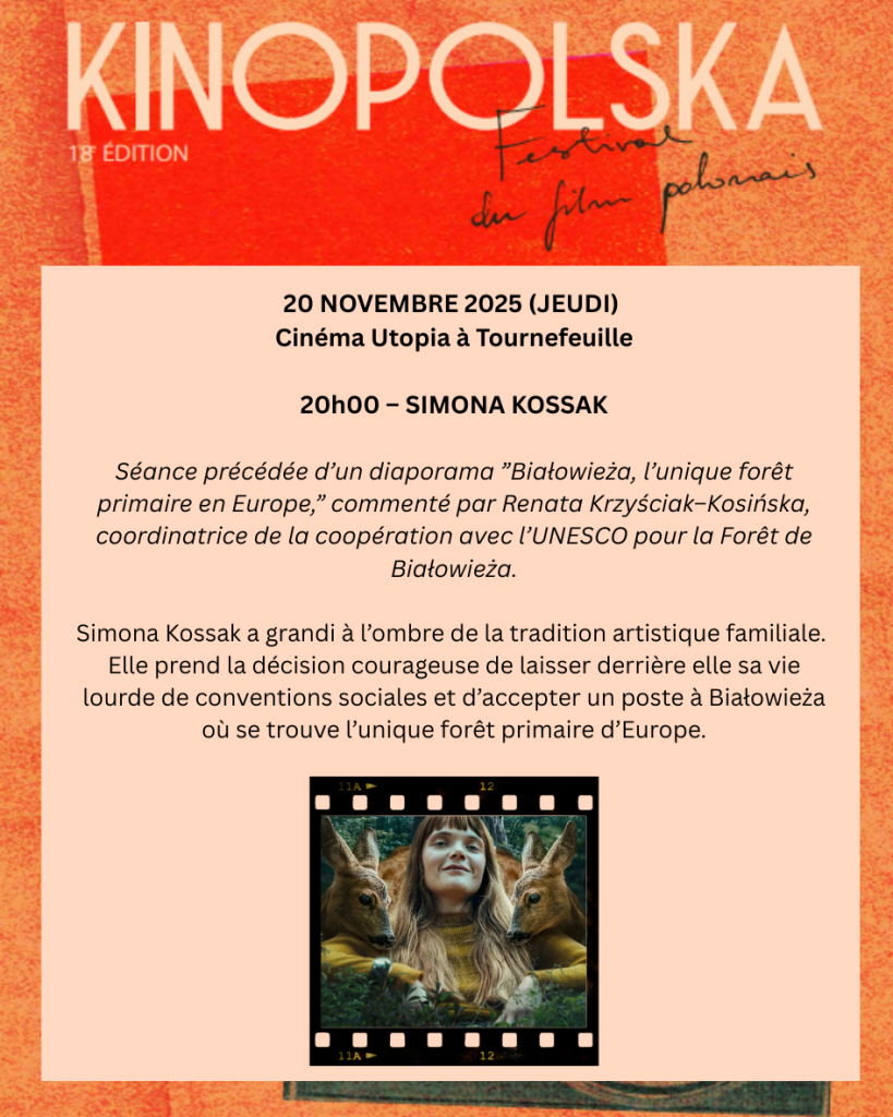 La troisième journée du festival qui aura lieu au cinéma Utopia de Tournefeuille est un temps fort autour du thème « préservation de l’environnement » ; Simona Kossak d’Adrian Panek est l’histoire d’une biologiste qui, après avoir obtenu son diplôme, décide de quitter Cracovie et de commencer à travailler à Białowieża où se trouve l’unique forêt primaire d’Europe. Cette séance sera précédée d’un diaporama commenté par Renata Krzyściak–Kosińska, coordinatrice de la coopération avec l’UNESCO pour la Forêt de Białowieża et suivie d’une table ronde réunissant des chercheurs : Marie–Line Maublanc, Jean–François Gérard (Comportement et Écologie de la Faune Sauvage) et Renata Krzyściak–Kosińska.