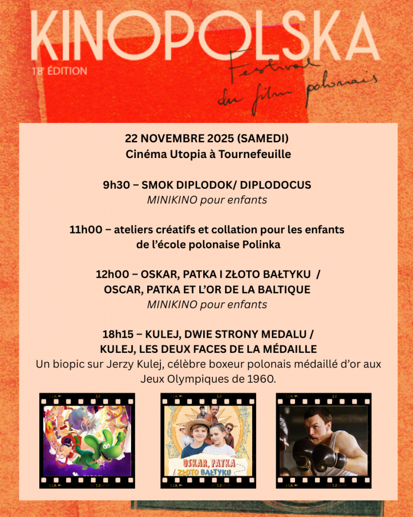 Le festival se termine le samedi 22 au cinéma Utopia. La matinée sera dédiée aux enfants de l’école polonaise Polinka – MINIKINO – avec deux films de fiction : Smok Diplodok / Diplodocus en version française et Oskar, Patka i Złoto Bałtyku / Oscar, Patka et l’or de la Baltique en version polonaise. Dans la soirée, sera diffusé le film de Xawery Żuławski, Kulej, dwie strony medalu / Kulej, les deux faces de la médaille, un biopic sur Jerzy Kulej, célèbre boxeur polonais médaillé d’or aux Jeux Olympiques de 1960 avec, en toile de fond, la situation politique en Pologne dans ces années–là.